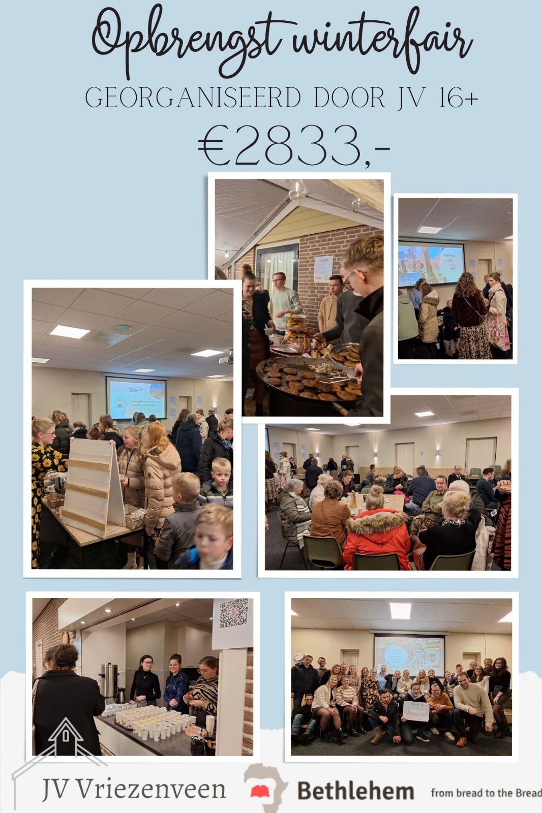16 februari was het zover… onze allereerste wintermarkt is een feit. Na een lange tijd van voorbereiden hadden we een heuse markt met een boekenkraam, overheerlijke broodjes hamburgers en zelfgemaakte snert. Maar ook aan de kids werd gedacht en voor hen hadden we een kleurplatenwedstrijd. Voor de keukenprinsessen werd er een taartbakwedstrijd gehouden (en het proeven/beoordelen was natuurlijk een feestje). Negen overheerlijke taarten werden gebracht. Bij de koffie hadden we natuurlijk een lekker taartje te koop. Daarnaast verkochten we kaarten, haarspeldjes, zelfgemaakte kaarsen, sleutelhangers en nog veel meer. De totale opbrengst van de winterfair is €2833,-.